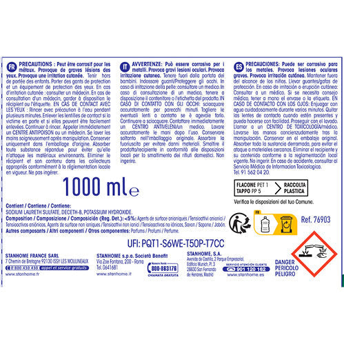 Conservar alejado del calor y en lugar bien ventilado. No utilizar sobre parquet, terracota, mármol y suelos pintados. Puede ser corrosivo para los metales. Provoca irritación de la piel. Provoca daños oculares graves. Peligroso, seguir las precauciones de uso.