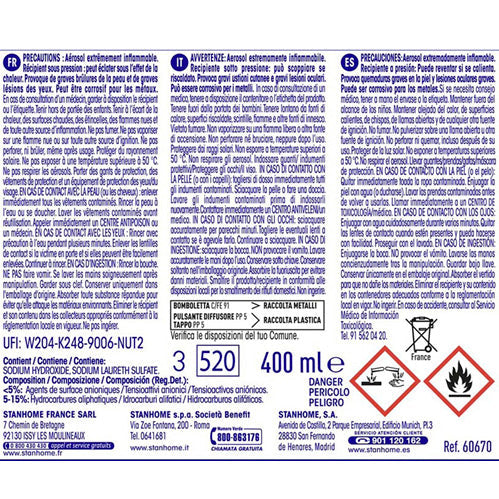 Aerosol extremadamente inflamable. Recipiente a presión. Puede explotar si se calienta. Puede ser corrosivo para los metales. Provoca quemaduras graves en la piel y daños oculares. Peligroso. Respetar las precauciones de uso.